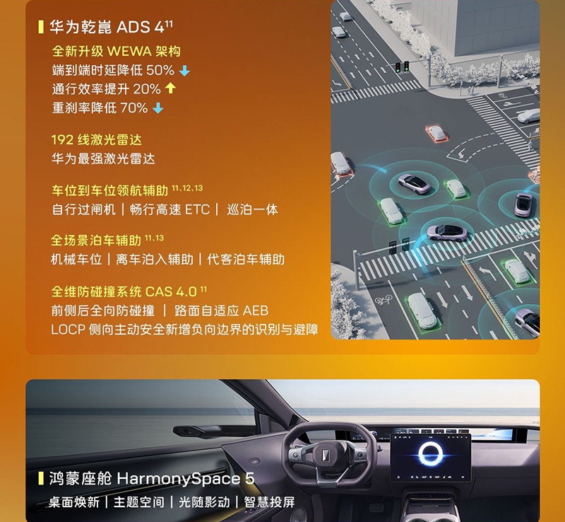 内饰方面,新车采用35.4英寸远端屏搭配15.6英寸中控屏及远端屏。新车还将搭载鸿蒙座舱HarmonySpace 5,搭载乾崑智驾ADS 4,支持车位到车位领航辅助及泊车代驾等。动力方面,新车将提供纯电版及增程版。其中纯电版最大功率252kW,峰值扭矩365N·m,CLTC纯电续航650km;增程版搭载1.5T增程动力,电机最大功率231kW,峰值扭矩367N·m。并提供容量为31.7kWh电池组,CLTC纯电续航可达230km,综合续航1190km。