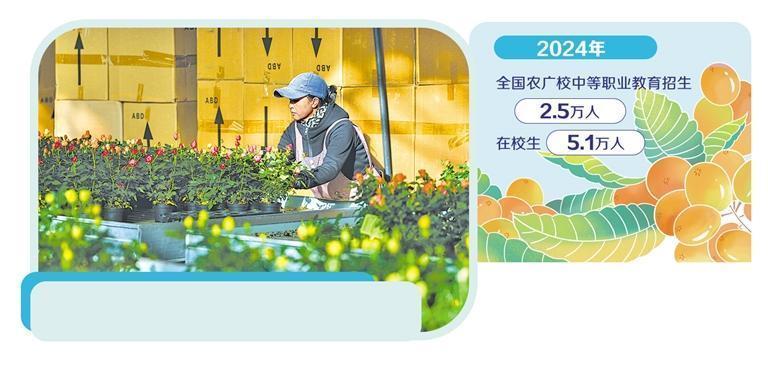 农民职业教育是培育高素质农民的基础。在第七届全国农民教育培训发展论坛上,中央农业广播电视学校负责同志表示,2024年,各涉农职业院校全面深化职业教育改革,通过动态调整专业结构、创新人才培养模式、提升技能培训效能等多种措施,大力培养农业技术技能人才。2024年,全国农广校中等职业教育招生2.5万人,在校生5.1万人。